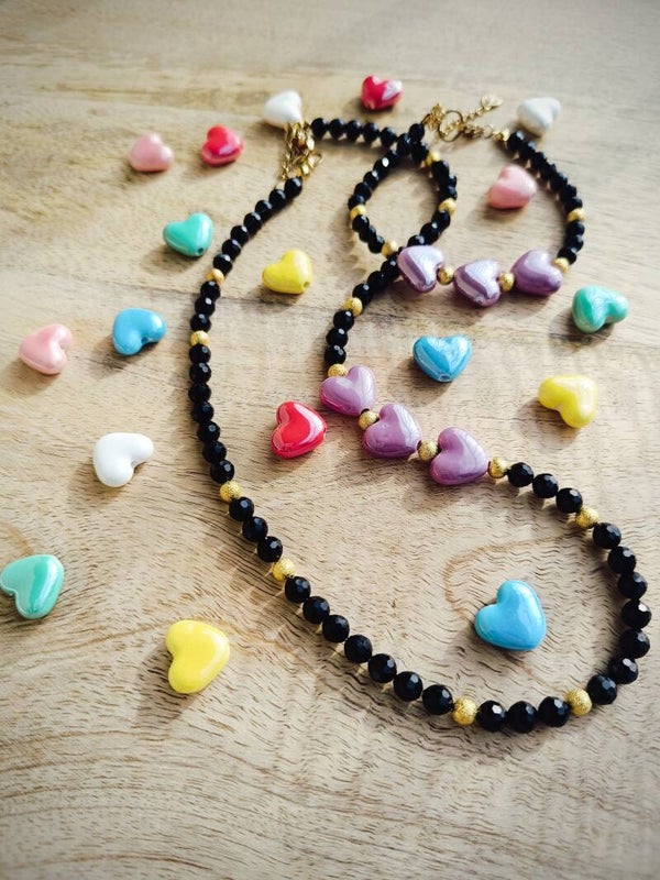 Całość dopełniają ceramiczne serduszka, które w zależności od zestawu występują w różnych kolorach – od subtelnych pastelowych tonów, po bardziej wyraziste i nasycone barwy. Dzięki temu każdy zestaw ma swój niepowtarzalny charakter i pozwala wyrazić indywidualny styl.